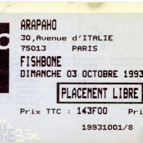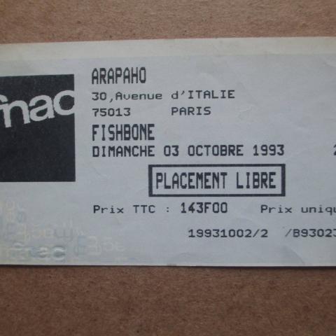 Donc Arapaho salle de 350 places avec le mythique poteau au milieu qui bouche la vue! :) le concert avait été quand même annoncé par des flyers : "concert exceptionnel 130F le 3 octobre 93 à l'Arapaho places exclusivement en vente aux FNAC". Mais en fait c'était 143F, sacré Fnac!!