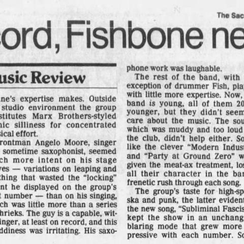 One of the nice things about Sacramento shows is that most people seem unaware of them, which allows for low ticket prices. Like the Coffee House of early days, when you could see the relatively unknown Police or Talking Heads at roughly one-fourth to one-fifth of their latest coliseum admission, up-and-coming bands stop at places like the Club Can't Tell and play to small audiences attracted by word of mouth or an article they read somewhere. I, the latter. The Chronicle Datebook gave Fishbone an attractive two-page spread, yet they were playing Sacramento, a few weeks later, at a measly three bucks. They played two highly energetic sets instead of the usual mechanical, play-by-rote set that certain bands get away with, especially when they would rather give their all in San Francisco and not in some nondescript town. Fishbone played some reggae, but most of it was kind of manic ska-funk. Tempos would change abruptly during their songs, sometimes double time and sometimes a fractured syncopated rhythm, causing the audience to do some improv-contorted skanking or an insouciant one-two onetwo or the catatonic bafflement. It sounded like James Blood Ulmer teaching the English Beat the correct way to play. The group's look matched their style of playing. The guitarist, decked out in a diamond long-sleeved shirt and shorts that went down to the knees, resembled somebody from the Little Rascals, thin, babyfaced, with shaved pate. The organist had a Buckwheat hairdo grown to Eraserhead proportions. At times, he would spin frantically on the stage floor, and once he nearly fell off the stage while doing some epileptic dance steps to a song about alcohol. The drummer had a Grace Jonesstyled mohawk. The bassist had a gush of Rastafarian locks. And the singer, wearing avaiator goggles circa 1930, plus farmer boots, had the right mixture of goofiness and "okie beebee" (translated "OK baby") sassiness. He'd lazily swagger across the stage in counterpoint to somebody else moving rapidly alongside him. Of course, the low price may also be the Club Can't Tell's way of paying the customer to endure 3 Mouse Guitars. They weren't bad; it's just that their act is based on an irritating novelty: after every song, the trio swaps their instruments with each other. In other words, all three get a chance to play drums and bass and guitar. After a while it's obvious that one person is better on one instrument than another. After a while the novelty stops hiding the lack of any original musical ideas.