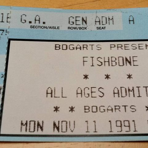 One of the most intense & insane shows EVER! This was for the album, 'Reality of my Surroundings,' & right before Kendall Jones went bonkers and left the band. They started with 'Everyday Sunshine' & went into 'Sunless Saturday.' i was at the very front. Bogart's still had a wooden barricade. I had both my arms up against it. When the first song was playing, I, as well as the three other people next to me, & the bouncer in front of me, heard it crack very loud. When the second song was playing, it totally cracked open, and went at an angle up onto the stage, where the SOLD OUT crowd started climbing up it like a cat walk, and started stage-diving. They stopped the show, and since it was sold out, had to break it up into pieces while they took those pieces out the back elevator. All the while, Fishbone kept playing a loungy-jazz number while Angelo was recording it on camera. Got to meet them & became good friends with them that nigh t