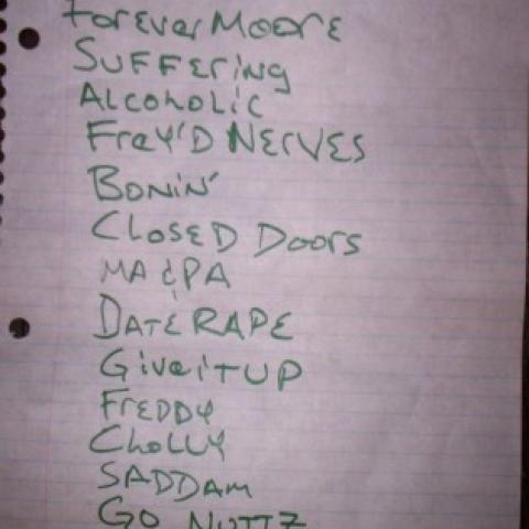 wow! i almost forgot how much fun a fishbone show could be! i hadn't seen them since 1992! voodoo glow skulls played before fishbone. i caught the end of the glow skulls set and there was a good turn out, but by the time fishbone came on a lot of people had left, which i thought was sad. the boys came out and had fun anyways! during alcoholic they did a little of van halen's running with the devil. i thought that was kool! date rape was nice to hear live. i really liked that they did give it up! an oldie but goodie! during freddies dead a drunk chick named vanessa got on stage and danced with angelo. then before they went into cholly, angelo invited a bunch of chicks on stage to dance and called them the fishbone dancers. i really liked when dre sang lead too! i was surprised that they didn't play party at ground zero, but i got a setlist (see picture below) from one of the roadies after the show and it was supposed to be the last song after ho's fight, but i think they had to stop because it was past closing time. i just want to say "THANK YOU" fishbone for coming out to my little shithole of a town and playing for us! a good time was had by all! peace y"all!