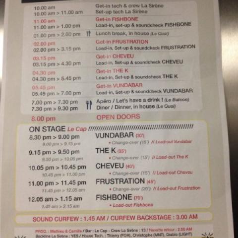 Show started at 1.00 am, 90 late from original schedule as 4 others bands were playing before. Too late ! Audiance was not very crowded and not very "active". Maybe too tired to move ! The band was as usual, great musicians, Angelo doing his best to push the audiance. But no reaction. The band played 1hour and 20 minutes, the shortest Fishbone show ever for me ! Quite disappointed, I cannot blame the band, late start, quite audiance. See you an other time an other place for sure !